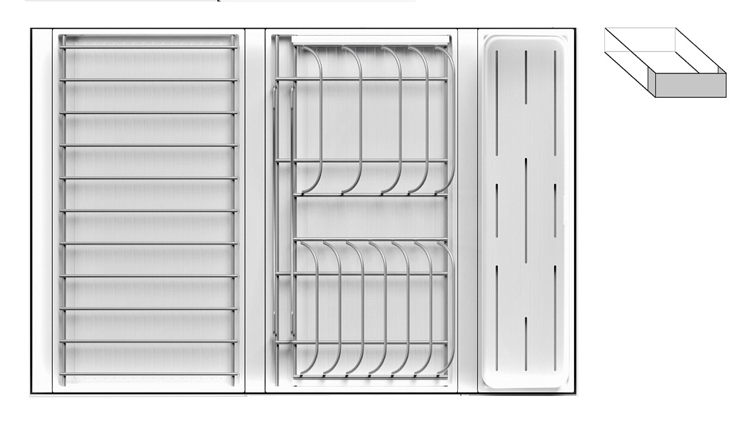 1 для столовых приборов (состоит из: 1 х емкость пластиковая 400 х 100 х 120 мм, 1 х поддон пластиковый 423 х 124 мм)