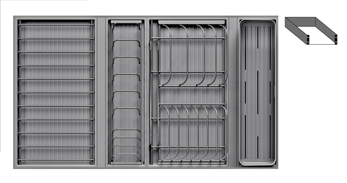 1 для столовых приборов (состоит из: 1 х емкость пластиковая 400 х 100 х 120 мм, 1 х поддон пластиковый 423 х 124 мм)